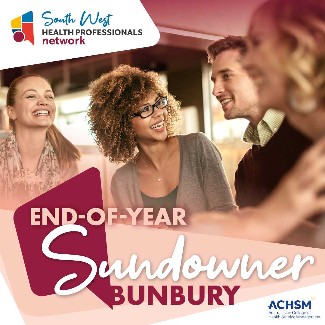 The South West Health Professionals Network would like to invite you to our end-of-year social sundowner event to celebrate the year that was 2023. When: Sunday 3 December 2023 Time: 3.00pm-5.00pm Where: Waters Edge Cafe & Restaurant - 42 Cobblestone Drive, Bunbury. Light refreshments provided. Places are limited. Registrations are essential, click HERE to register! This event is FREE for members of the South West Health Professionals Network – Click HERE to join as a member (membership is free). For more information, please email SWHPN Program Officer June Foulds at contact@swhpn.com.au.